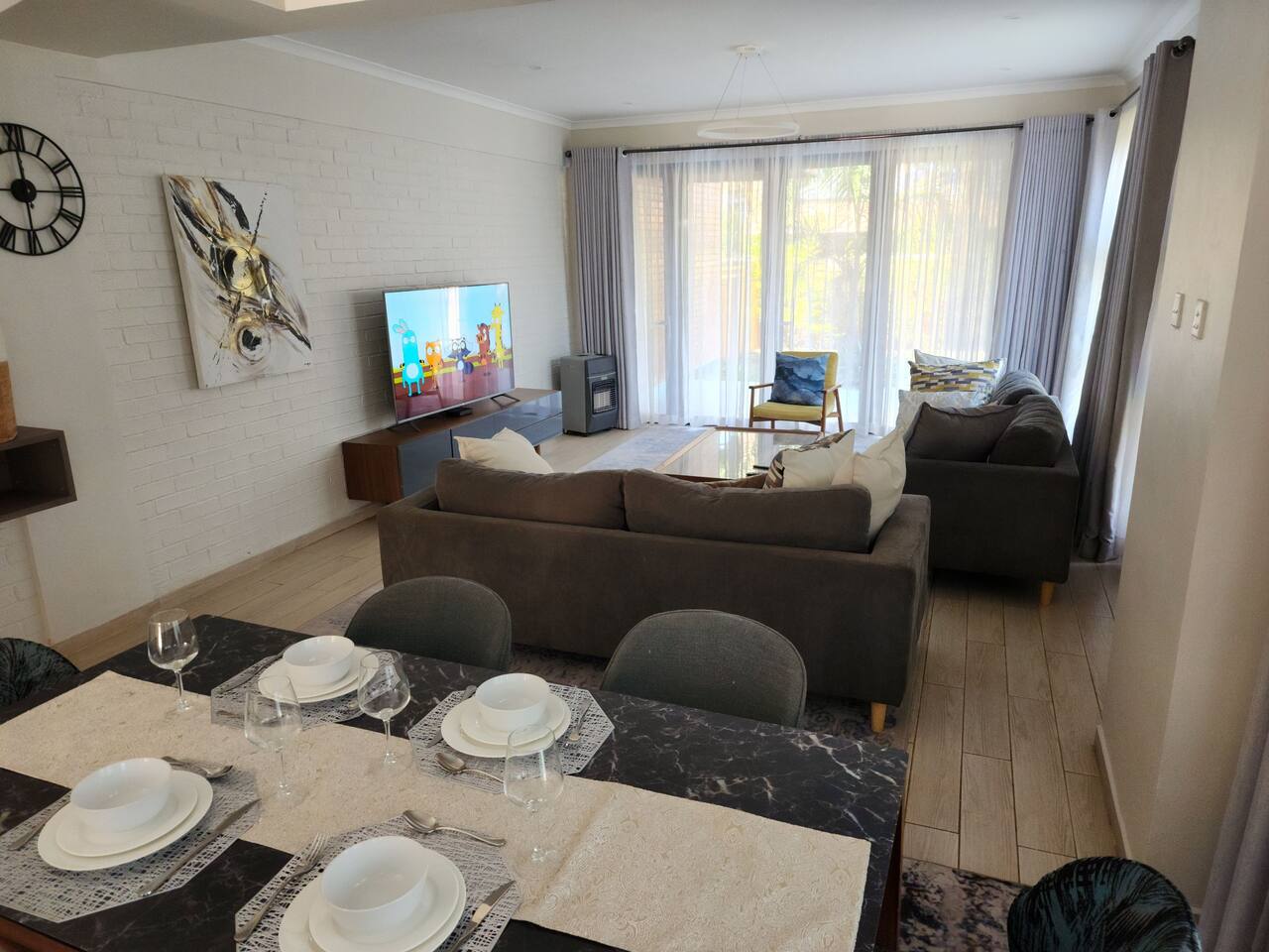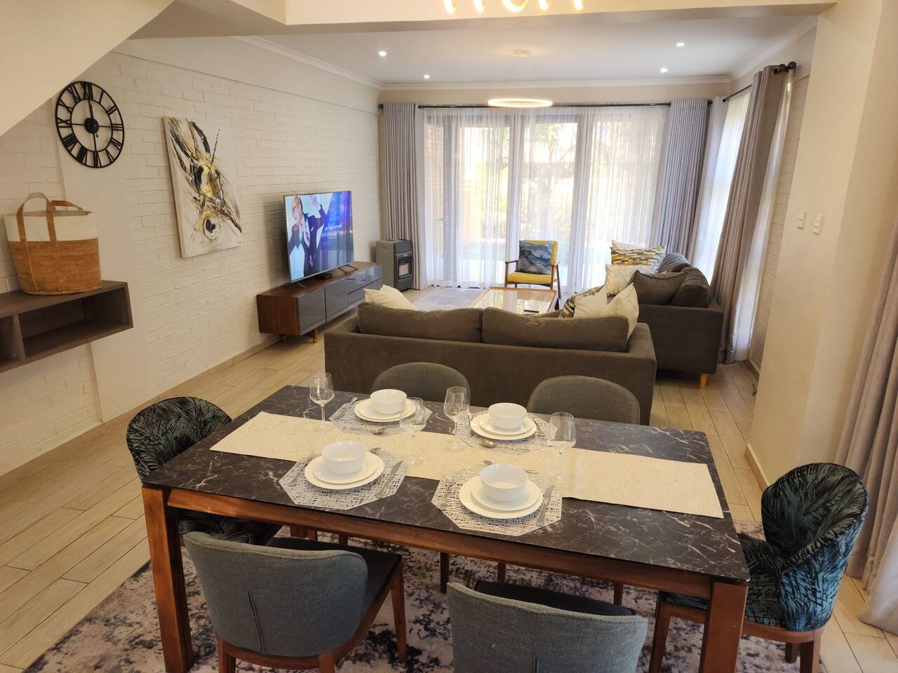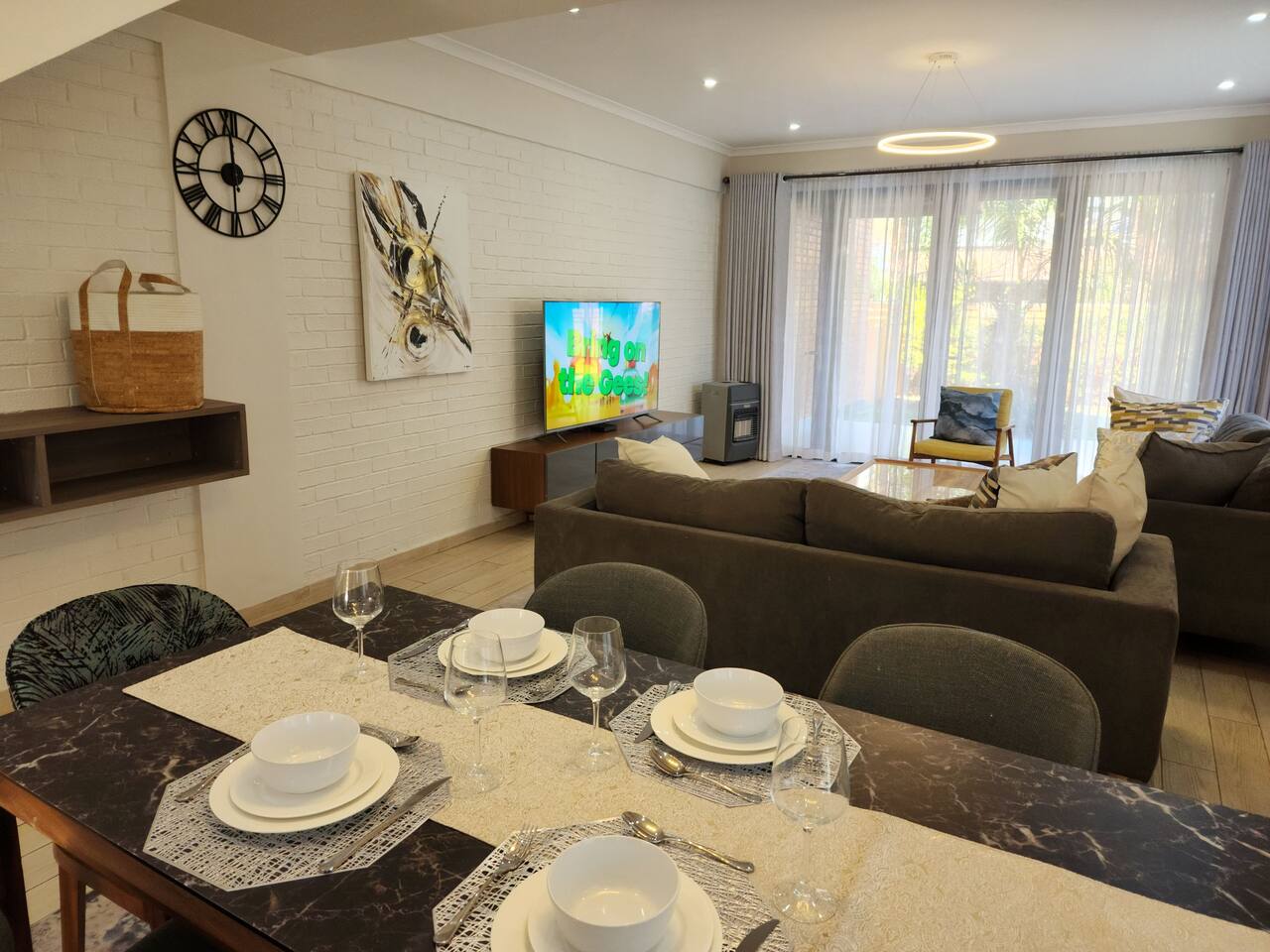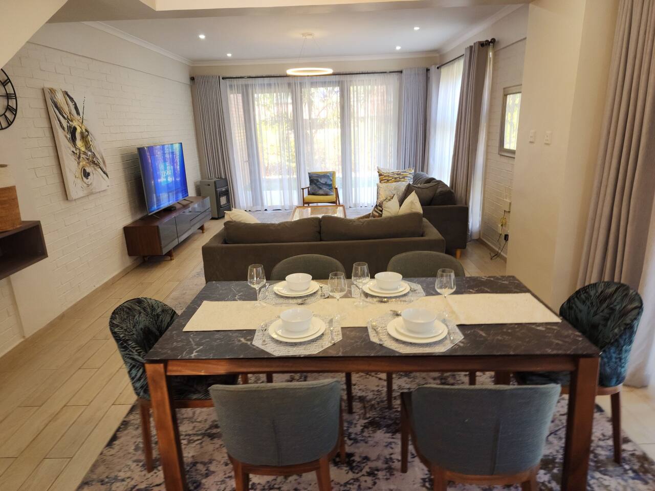 Dive into the Pulsating Heart of Harare: Harare beckons, with mbira melodies weaving through bustling markets, sun-drenched maize roasting in vibrant alleys, and Jacaranda blooms painting streets in amethyst. Immerse yourself in the spirit of the Shona people, their warmth as rich as the tapestry of culture and flavors that await. Your Zimbabwean retreat awaits, a luxurious haven where open-concept living melts into sun-drenched serenity. Plush couches invite you to sink in, while expansive windows bathe the space in warm light. Outside, palm trees sway in a whisper of wind, whispering secrets of a vibrant world beyond. This eco-friendly garden seamlessly blends nature with modern comfort, offering a tranquil oasis in the heart of the city. Once settled, prepare to ignite your Zimbabwean adventure: ✓Fuel your mornings with freshly brewed coffee, savoring the quiet moments in the fully equipped kitchen. ✓Dive into cinematic escapades, watching your favorite movies on Netflix and Amazon Prime. ✓Challenge friends and family to a spirited game of billiards in the buzzing clubhouse, or unwind in the trendy lounge. ✓Let your children unleash their laughter in the nearby playground, a haven of slides, climbing walls, and endless fun. ✓Embark on thrilling journeys: explore the ancient wonder of the Great Zimbabwe Ruins, marvel at the Domboshava Rock Paintings, or lose yourself in the vibrant tapestry of Harare on a full city tour. ✓Tee off at nearby golf courses like Borrowdale Brooke Golf Estate and Royal Harare Golf Club, testing your swing against Zimbabwean landscapes. This house is more than just a place to stay – it's your gateway to experiencing the vibrant pulse of Zimbabwe. Embrace the adventure, explore the unknown, and create memories that will shimmer long after you leave. Bedrooms & Bathrooms After days spent exploring Zimbabwe's vast beauty, snuggle into sweet dreams in our 3 inviting bedrooms. Exposed brick walls whisper tales of adventure, while comfy memory foam mattresses promise deep slumber. Luxury linens embrace your skin like a warm hug, plump pillows cradle your head, and room-darkening shades ensure blissful uninterrupted sleep. Up to 6 guests can drift off here in pure comfort, each bedroom graced with a king-size bed, dual nightstands, and a spacious closet. As the sun dips below the horizon, pamper yourself with a rejuvenating escape in our 2 immaculate bathrooms. Melt away the day's echoes under a steaming hot shower or indulge in a relaxing bubble bath, aided by a thoughtful selection of essentials: ✓Hair dryer: for a quick blow-dry before dinner. ✓Body soap: leaving your skin feeling clean and refreshed. ✓Shampoo & conditioner: to pamper your locks after a day in the sun. ✓Fresh bath towels: soft and fluffy for ultimate comfort. ✓Starter pack of toilet paper: just in case. Emerged 100% refreshed, your next Sitari adventure awaits! Kitchen and Local Restaurants Rise and shine like a culinary superstar and strut your stuff in our dazzling kitchen, where sleek appliances and meticulous design create the perfect recipe for unleashing your inner chef. Get ready to sizzle and sauté in style, as you bask in the luxurious touches of this bright and inviting space. Featuring sleek countertops and a suite of high-quality cooking tools that will have you producing mouthwatering meals with ease: • Full-size refrigerator • Microwave and stainless steel oven • Electric stove • Kettle • Toaster • Gourmet knife set and cutting board • Pots and pans • Plates, bowls, mugs, glasses and silverware Don’t feel like cooking? Have peace of mind that you can savor your tastebuds in a range of international and local restaurants, all located within a 10-15-minute drive away: • Thai (Chang Thai Restaurant) • Greek (The Village Greek) • Italian (Aroma Caffè) • Ethiopian (Queen Makeda) • Breakfast (Oak Tree) • Lunch (Leovilla) • British Style Pub (The Bishop's Mistress) • Steak (Khaya Nyama Wombles) • Fine Dining (Victoria 22 Restaurant)